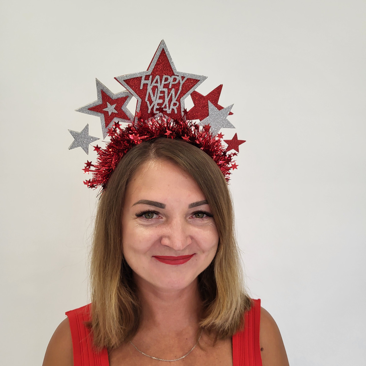 До вашої уваги яскравий новорічний обруч (обруч з зірками) та написом happy new year для завершення новорічного образу. Новорічна зіркова корона.