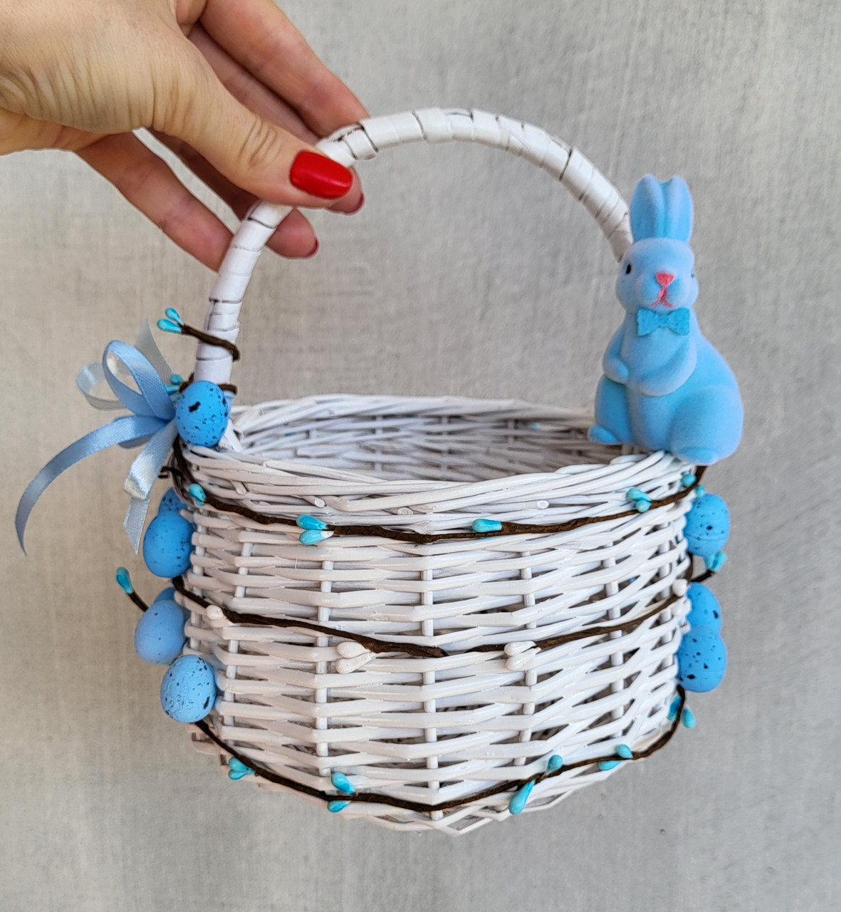 Дитячий великодній кошик плетений з лози та пофарбований у білий колір.